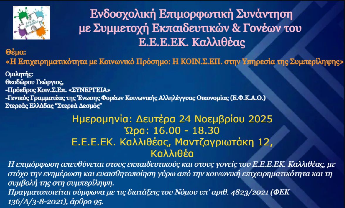 Το ΕΕΕΕΚ Καλλιθέας διοργανώνει την επόμενη επιμορφωτική συνάντησή του με θέμα: